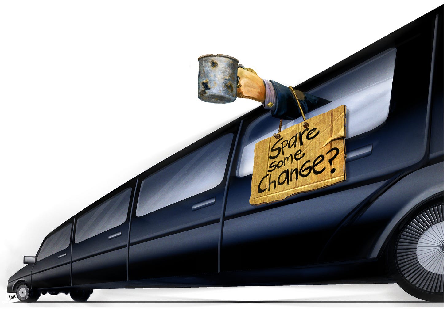 I painted this one for Utne Reader in 2012. Has anything changed in the last 13 years?… Well, yes. If I were to paint this scene today, the limousine would need to be at least three or four times larger.