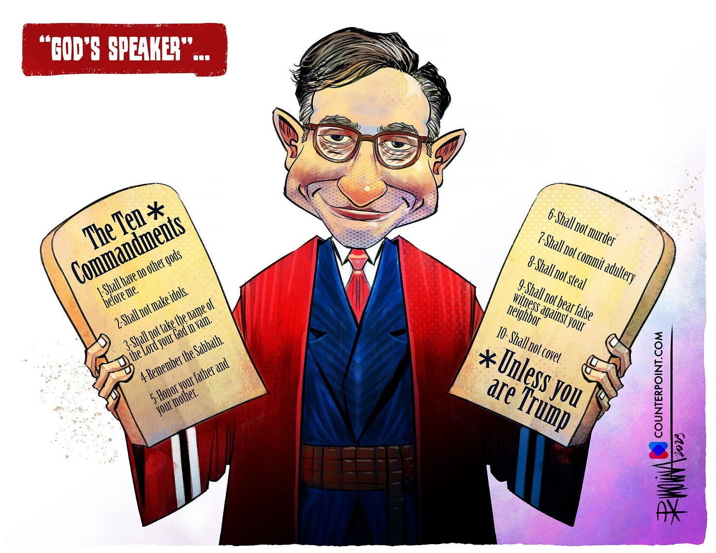 It is inconceivable that someone who identifies as a Christian could tolerate, accept, justify, or promote EVERYTHING contrary to Jesus’s teachings just to keep his boss happy. One of the worst examples of this is, of course, “God’s Speaker,” Mike Johnson.