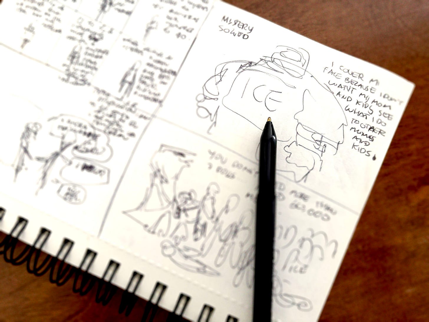 Most of the cartoons that I create on my digital drawing tablet begin as sketches in these notebooks. I like to think of them as the nursery where I plant ideas to see if they flourish. After letting them sit for a while, I revisit them to see which ones seem most viable.